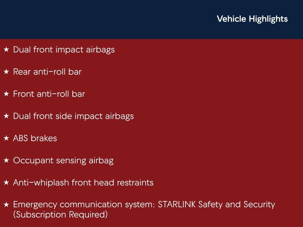 - Emergency SOS Capable STARLINK Safety and Security (Subscription Required) vehicle integrated emergency SOS system