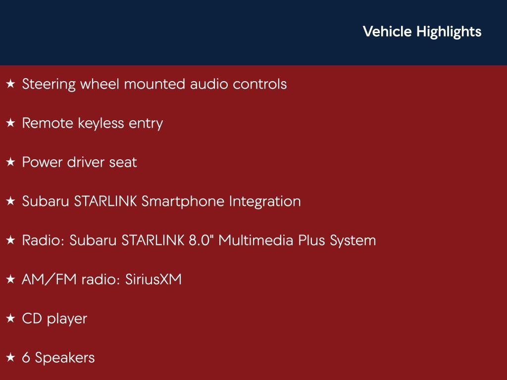 - Radio: Subaru STARLINK 8.0" Multimedia Plus System