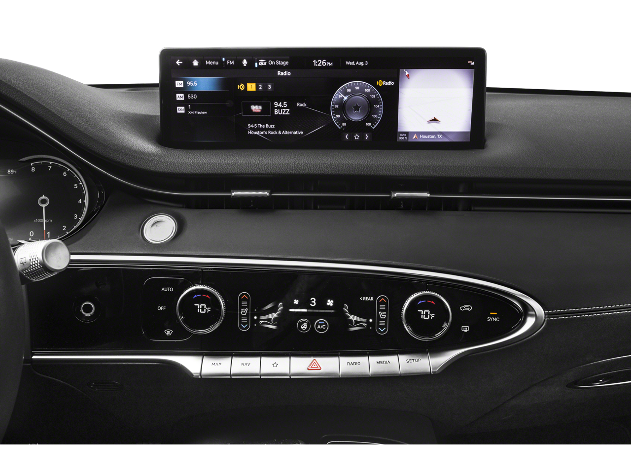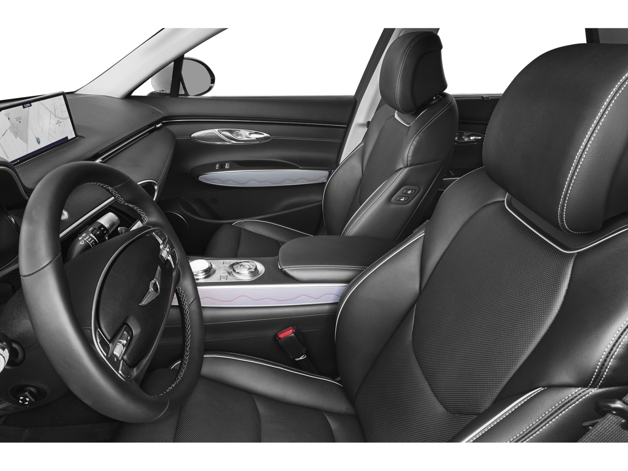 The cabin of the GV70 is a true sanctuary, with premium leatherette seating, heated and ventilated front seats, and a 12.3 3D Digital Instrument Cluster that puts vital information at your fingertips. The Lexicon Premium Audio system, with 16 high-efficiency speakers, envelops you in a concert-hall-quality soundscape, while the Adjustable Interior Ambient Lighting sets the perfect mood.